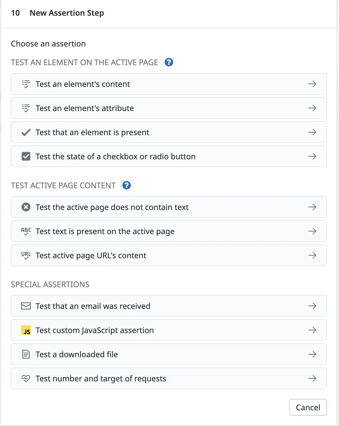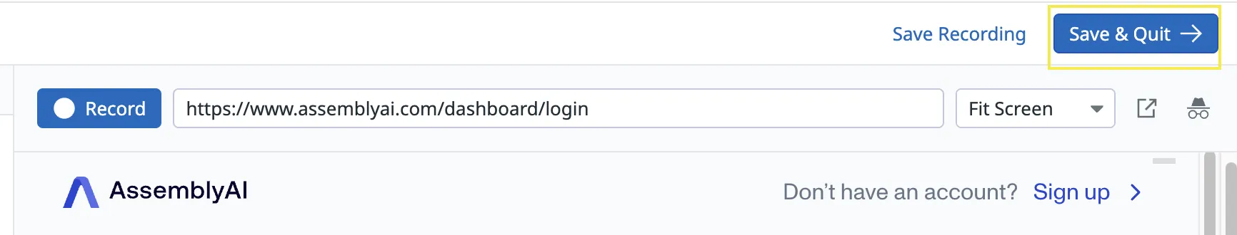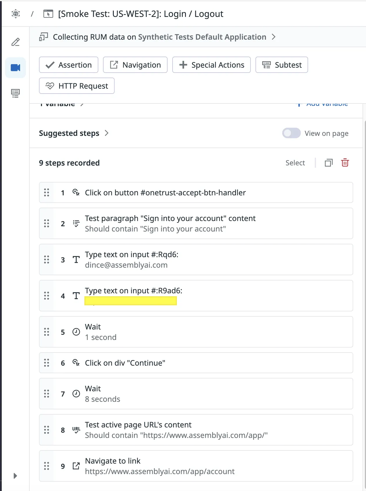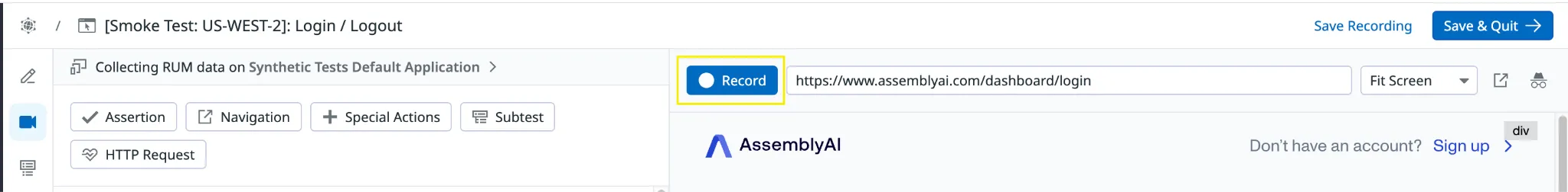 - To complete the browser test, add an assertion. This ensures that the test resulted in the expected state. If there are multiple states that need to be tested, for example in the above test we want to ensure the ‘Sign into your account’ button is visible on the home screen as well as that the page is redirected to the app (Page URL should contain https://assemblyai.com/app/’) after the login, add an assertion for each state.