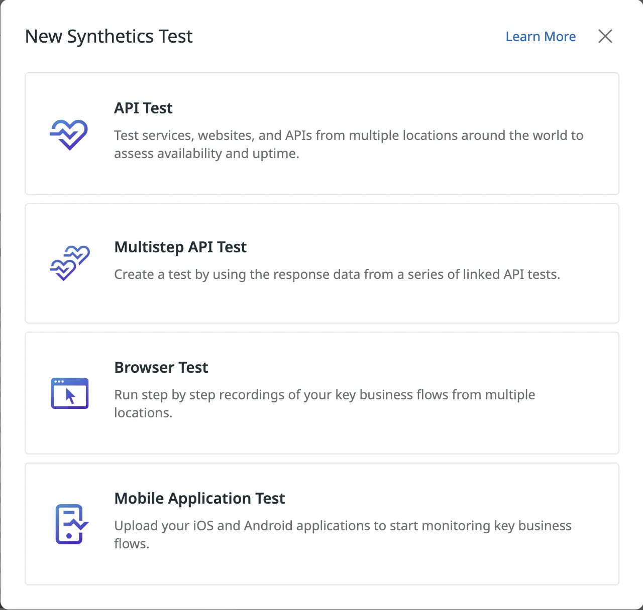 From the synthetic monitoring & testing main dashboard, select ’+ New Test’ in the top right corner.