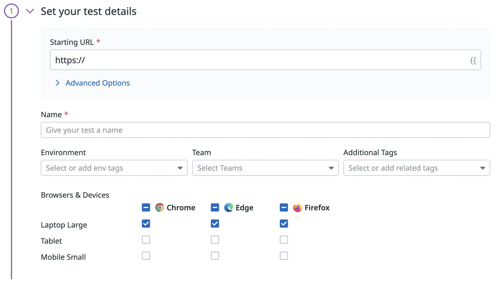 Here you’ll want to set the starting URL of where the browser test should originate from.