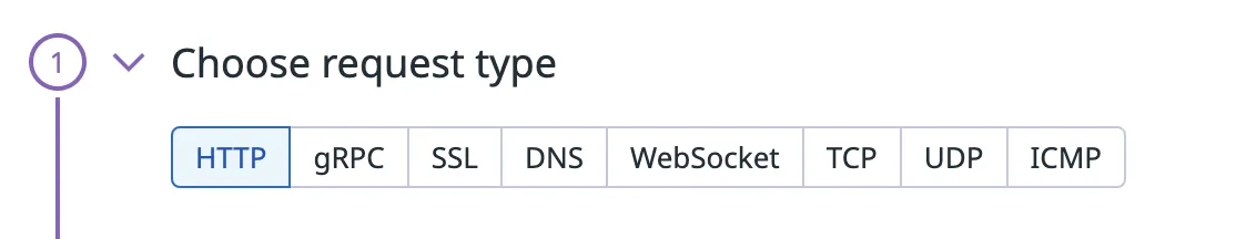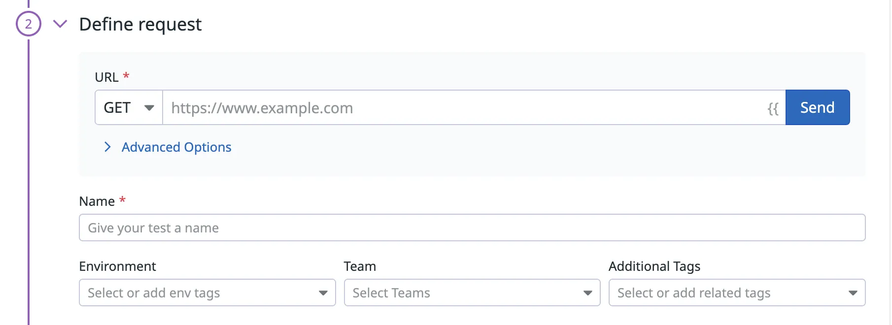 In this step you define the request by selecting which type of request, set the URL, set the name of the test itself and add tags.