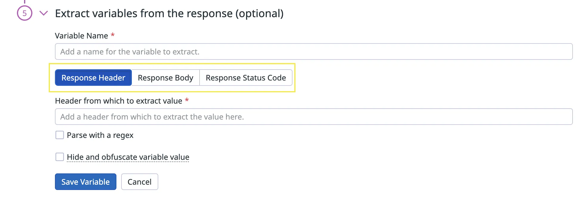 To extract a variable, first select the location of where the value is stored: Response Header / Response Body / Response Status Code and parse the value as instructed.