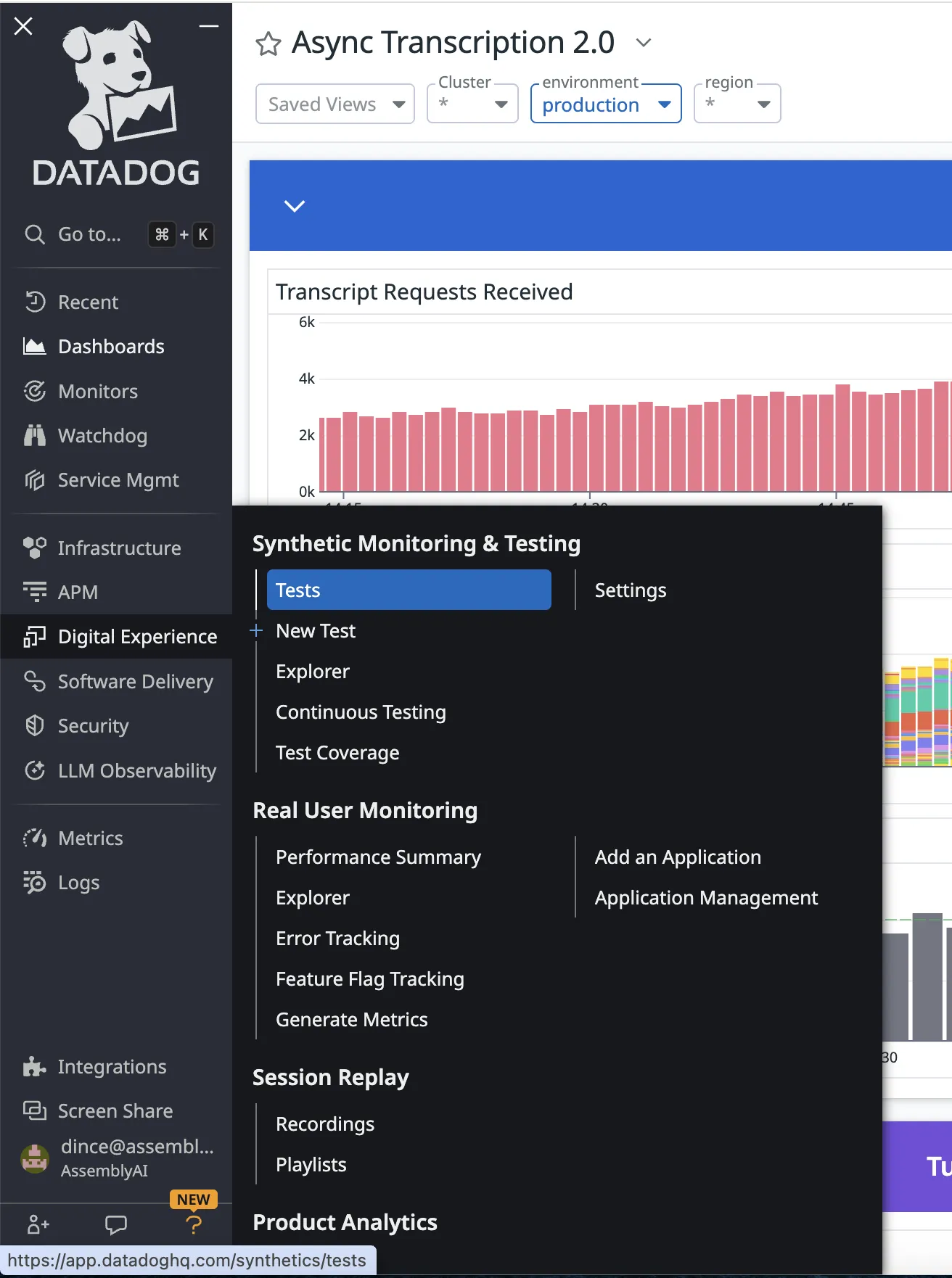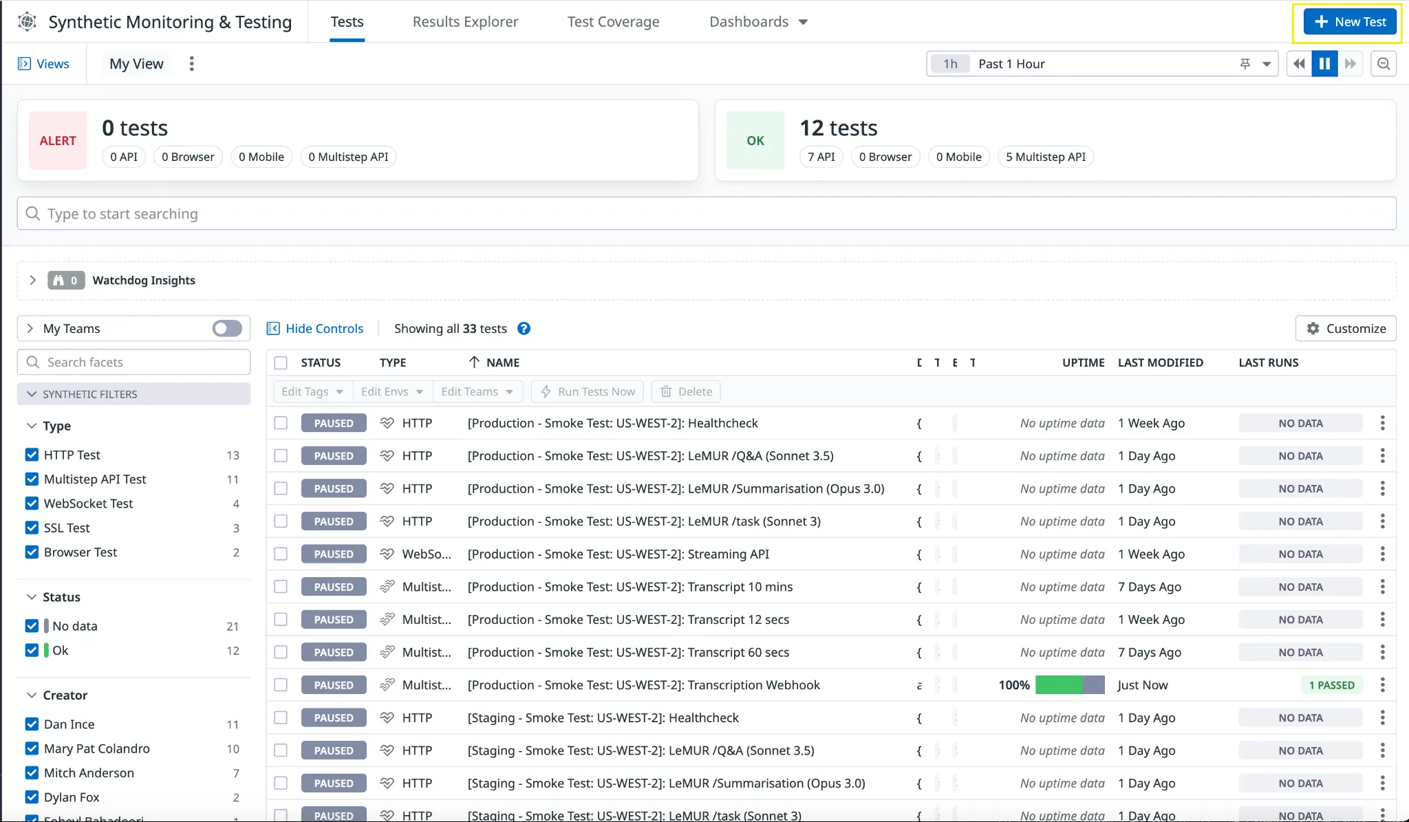 The smoke tests are found in the Datadog dashboard under: Digital Experience > [Synthetic Monitoring & Testing] > Tests