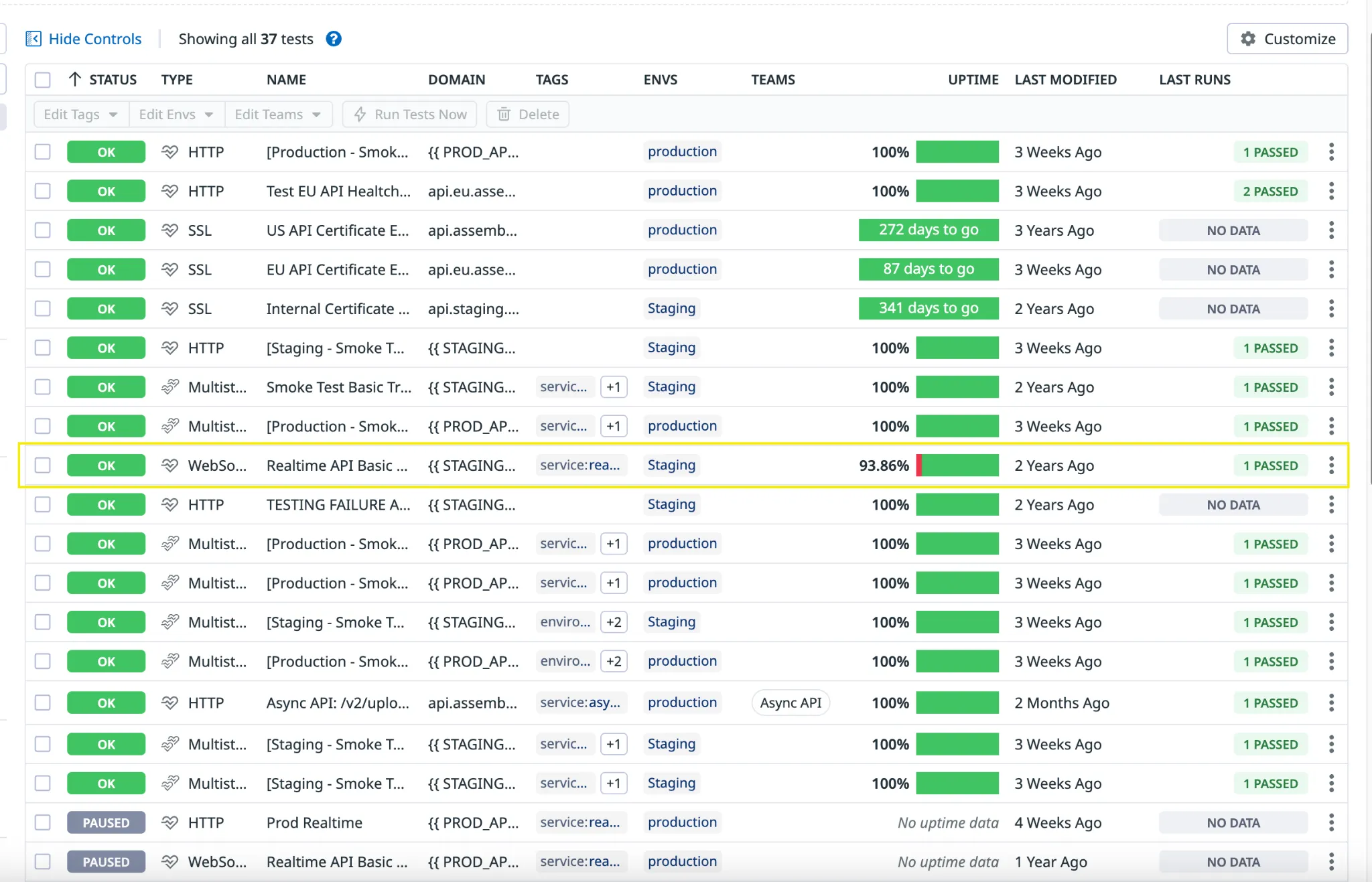 In the following screenshot, the highlighted test has a 93.86% uptime, which indicates that the test has failed 6.14% of the time. Click on the name.