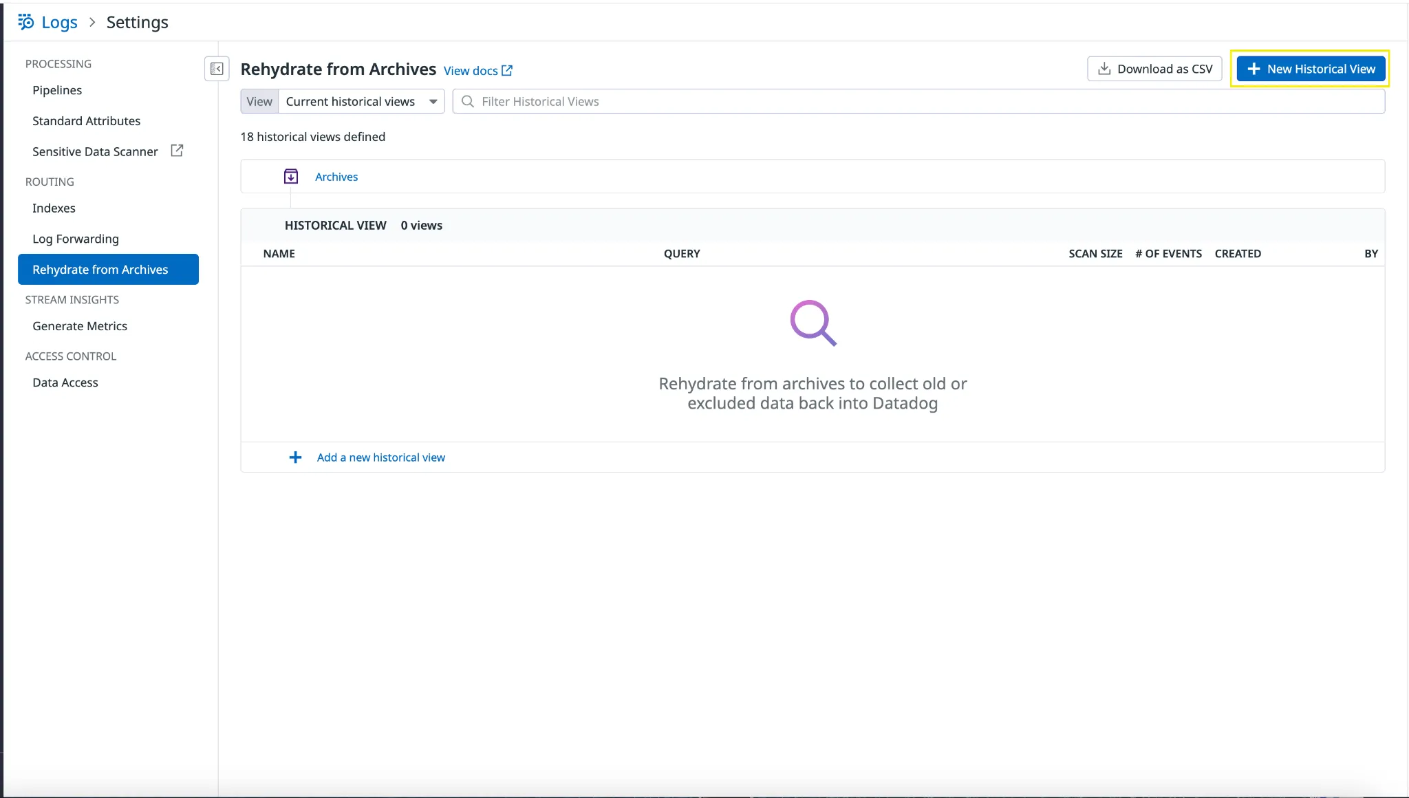 - Click the “New Historical View” button in the top-right corner of the page to create your log rehydration view.