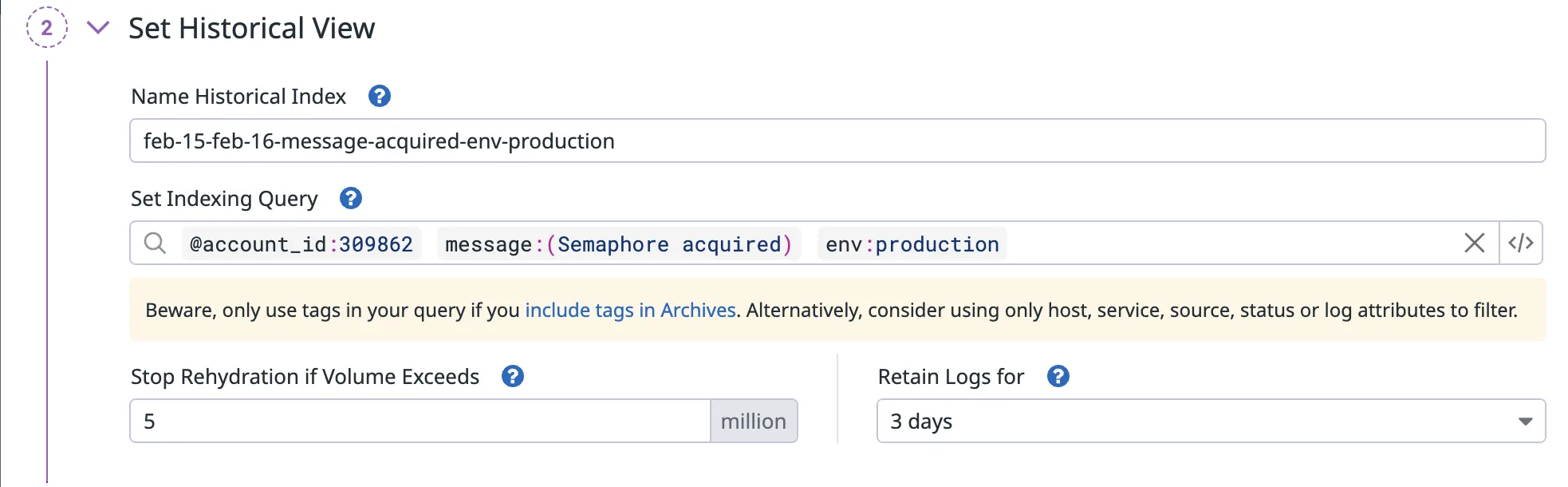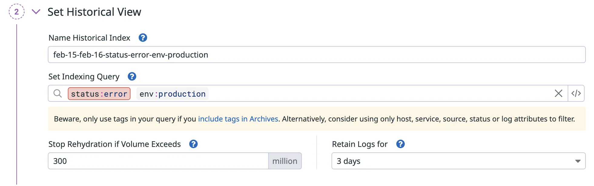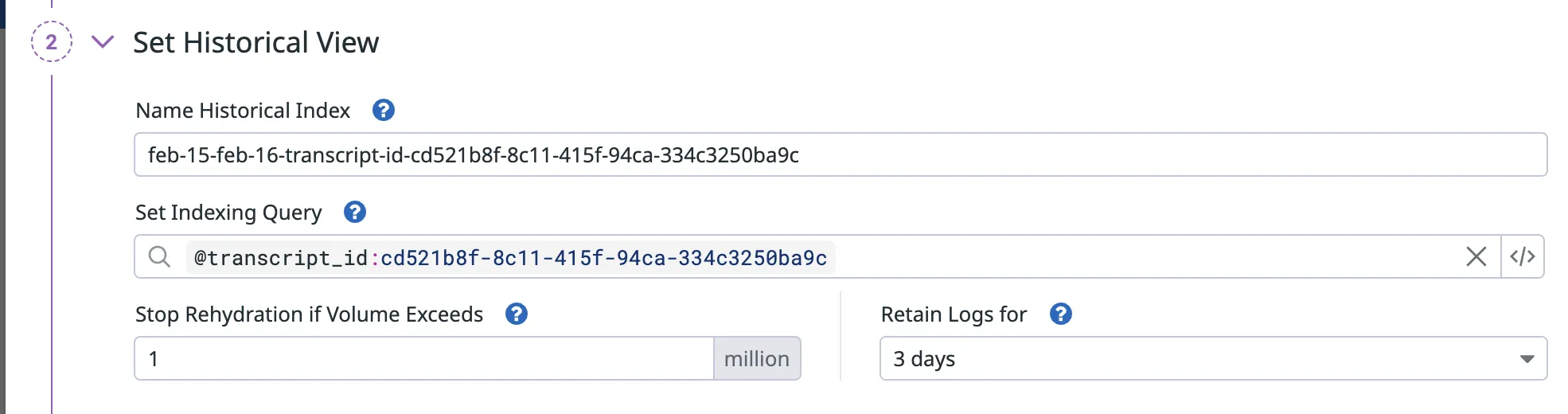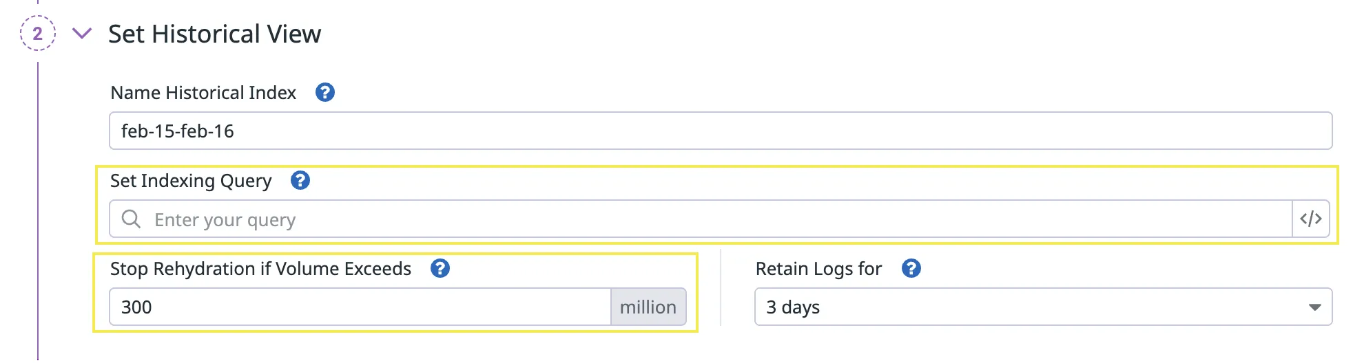 - In the “Set historical view” section, insert your log query into the “Set indexing query” field as shown below. Also, it’s recommended to edit the “Stop rehydration if volume exceeds” field to a lower number such as 10 million, as a safety guard for costs.
