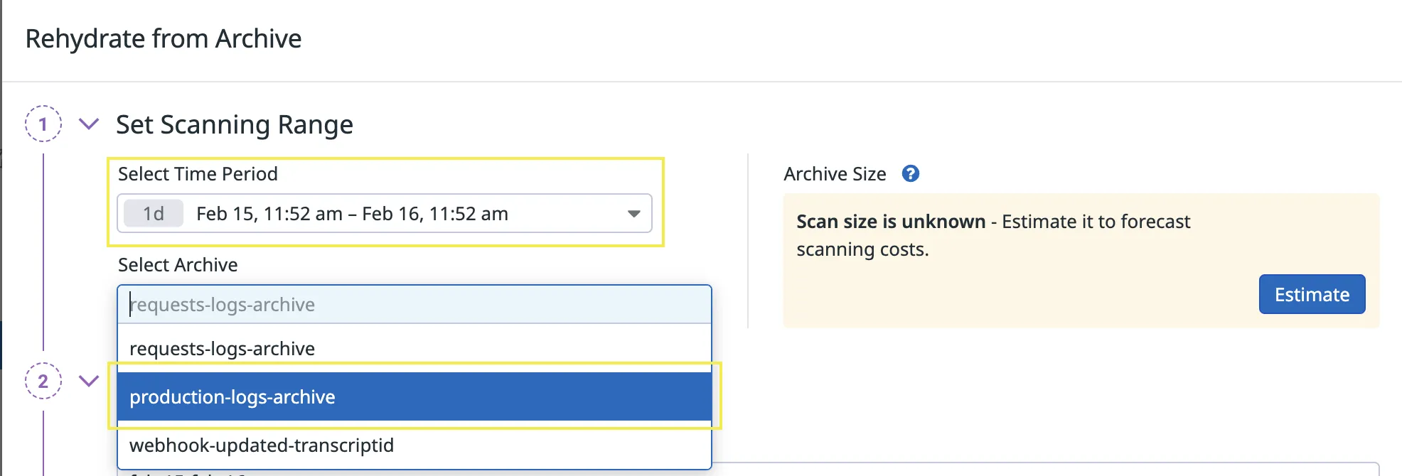 - Select a suitable time period of the log rehydration (you should have this in mind beforehand, or get a suitable time period from the customer) and be sure to select the production-logs-archive for the “Select archive” section.