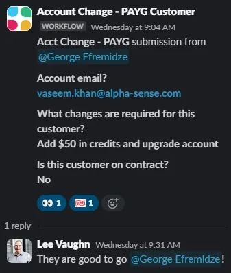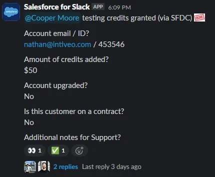 [Here is an example of a credit request surfaced in Slack:]{.mark}