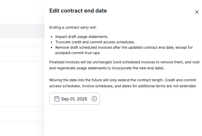 Select the end date of the contract as the day the plan begins (usually the 1st of the month). The input says “Ending before”, so this will end the contract on the selected date at 12:00AM. Then click Save.