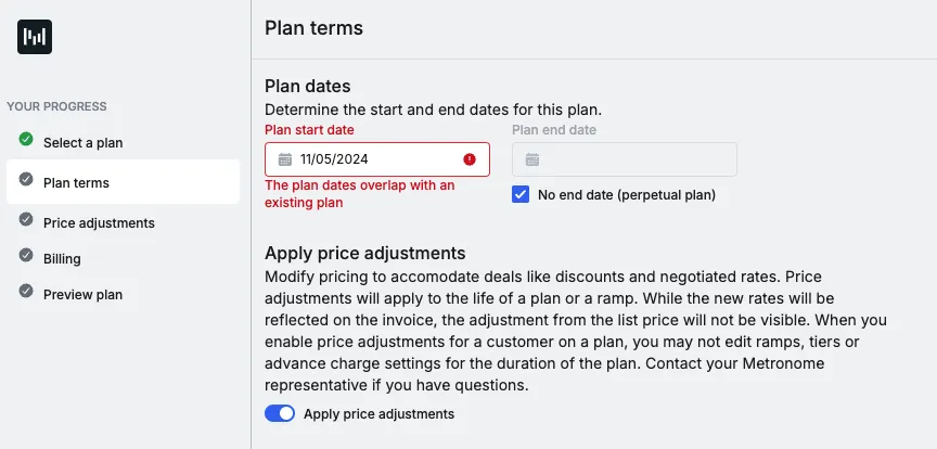 As a note, in most cases there won’t be an end date for a contract. If you forgot to end the current plan, you will see an error like in the screenshot below. If this is the case, you can just exit out of this plan wizard, end the current plan, and start again.