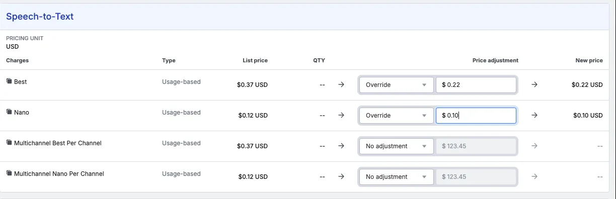 This will bring you to the Price Adjustments page. For any prices that need changing, select Override in the dropdown menu and then add in the adjusted price. Note: If adjusting prices for specific Universal models, make sure to also adjust the corresponding Multichannel Per Channel price to the same amount. Once all the prices have been adjusted, click Continue.