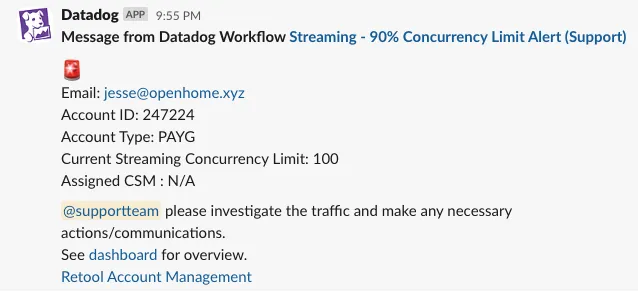 The streaming 90% concurrency limit alert is triggered when an account’s number of open sessions exceeds 90% of the account’s streaming concurrency limit. We use a 90% limit as this should provide enough time to react and action any necessary changes without affecting production traffic for the customer (once the limit is hit, they will no longer be able to open any new sessions).