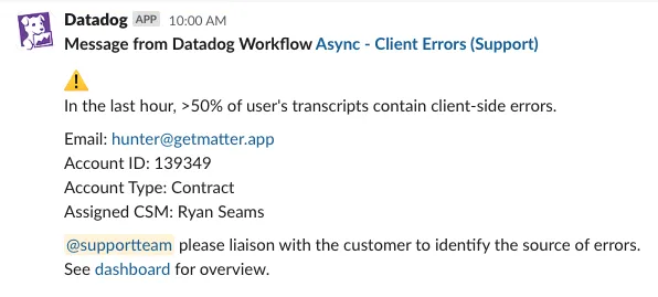 The 50% client errors alert is triggered when >50% of an account’s total transcripts in the last hour contained a client-side error. Currently, this alert is filtered for only contracted customers due to spam, however this is likely to be improved upon soon. We selected a 50% limit based on intuition that it is a high enough limit to signal a troubled customer, so this may be changed in the future.