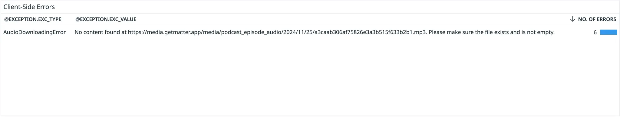 In this example, we can see the customer is experiencing an AudioDownloadingError due to the file not existing/being empty. As the number of occurrences is only 6, we can estimate that it was a temporary issue and shouldn’t be a blocker for the customer however it is still worth contacting the customer to make them aware of the errors and to guide them on how to reduce it from occurring again in the future.