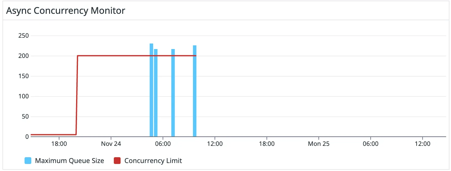 The Async concurrency breach alert is triggered when an account exceeds its concurrency limit by 10%. We use a 10% margin to reduce spam and to focus the alerts on accounts that indicate their current concurrency limit may not be suitable for their needs.