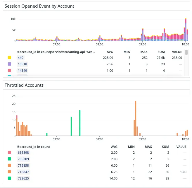 Go to Datadog and check the Streaming 2.0 dashboard. Scroll down to the “Session Opened Event By Account” and “Throttled Accounts”. Search for the account ID for the affected account to view the activity for their specific account.