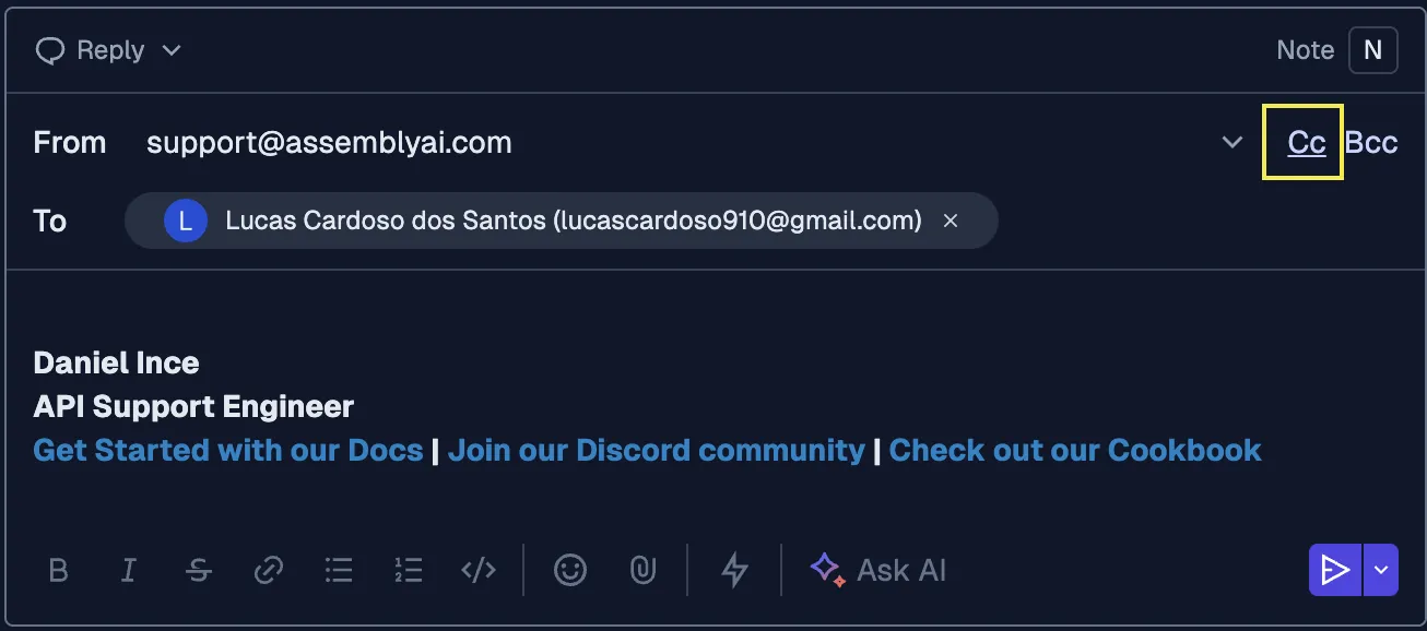 There may be times that you want to include the AE in your Pylon conversation with the customer, this is only applicable to email conversations. When that is the case the process for creating the lead will stay the same however you will need to conduct an extra step to CC them into the conversation.