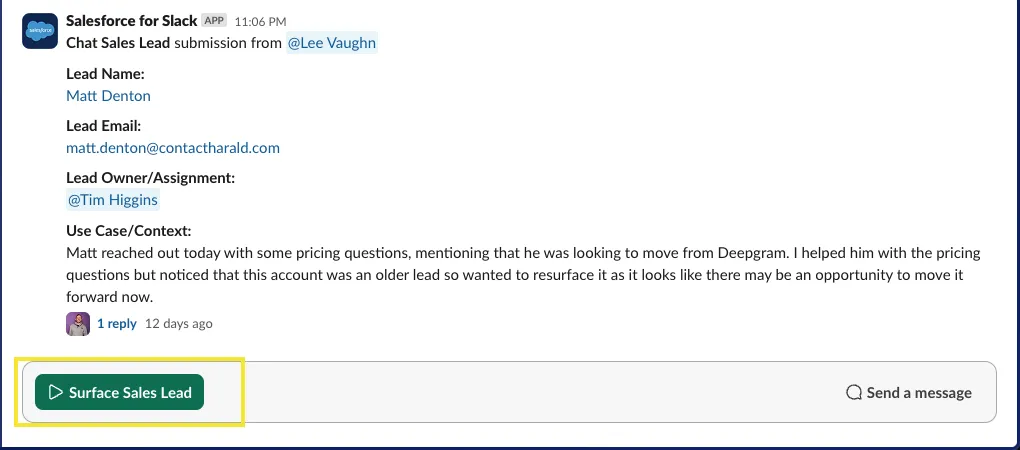 - This will create the sales lead in Salesforce and randomly assign it to an AE. If you wait a few seconds you will be able to see which inbound SDR was assigned to the account by checking the #chat-sales-leads channel.