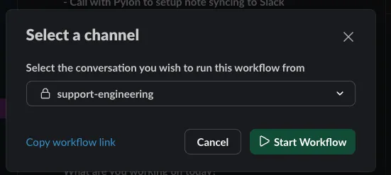 Once you click on that it will open a side panel in slack where it will give you the option to start the workflow.