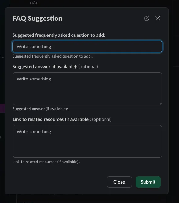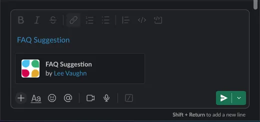 Once you click the “Submit” button a new post will appear in the #support-engineering channel showing your suggested question, which the team will review and add to the FAQ as needed.