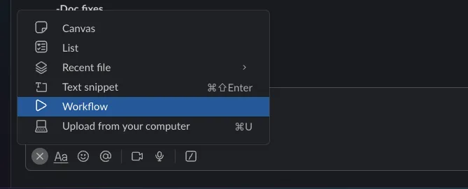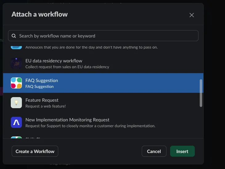 To suggest an addition to the FAQ, head to the #support-engineering channel in Slack. In the text field for the channel you will see a ”+” icon. Clicking that will open up a menu where you will see “Workflows”.