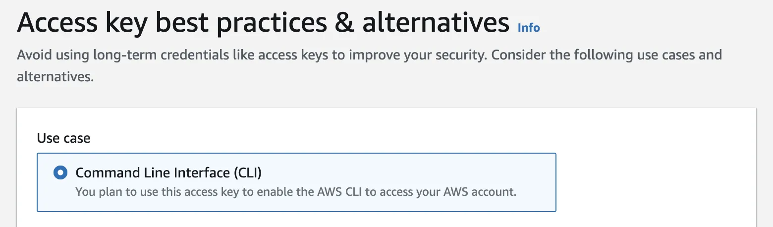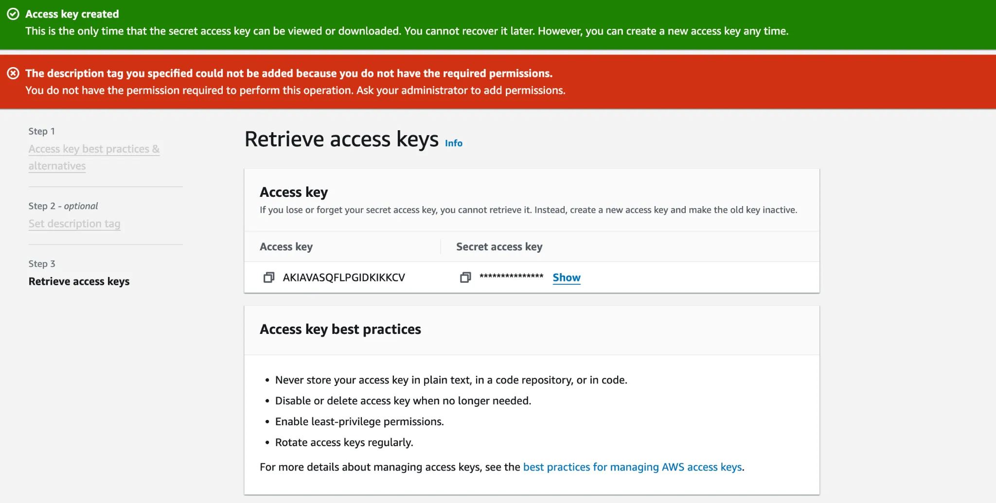 Your access key is created. You’ll need these credentials when we configure the CLI so keep this page open. Don’t be afraid of the red banners if you see them.
