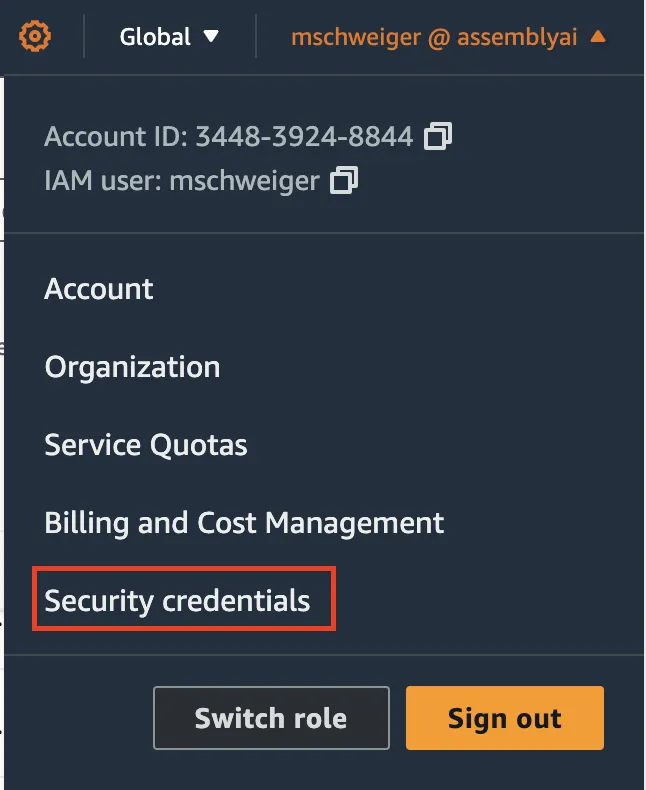First, create an access key for your account in the AWS console. Click on your account username on the top right corner and click on Security credentials.