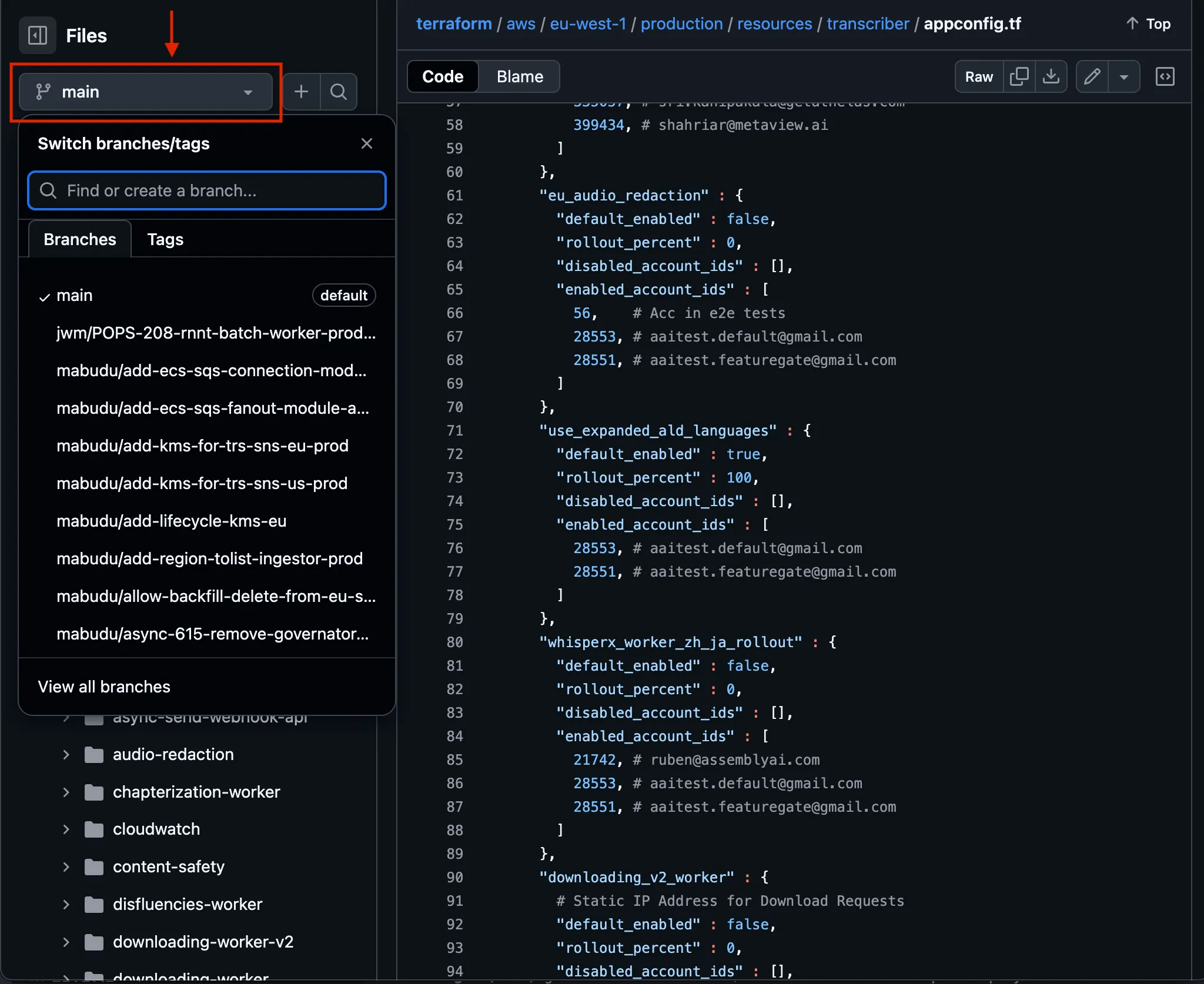 First create a new branch within the terraform repo, which you can do directly in GitHub by clicking on the branch button that says “main” in the left hand panel.